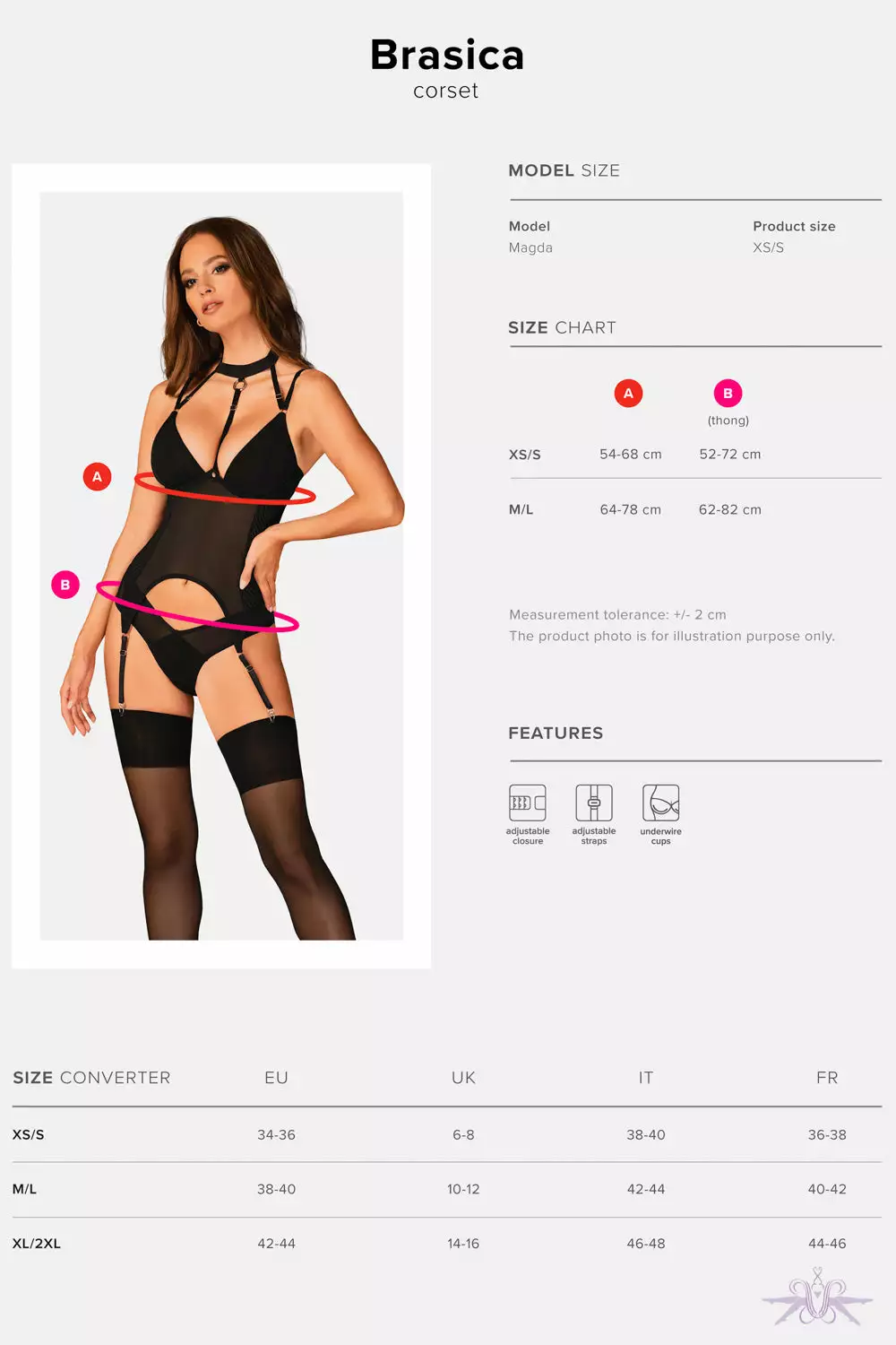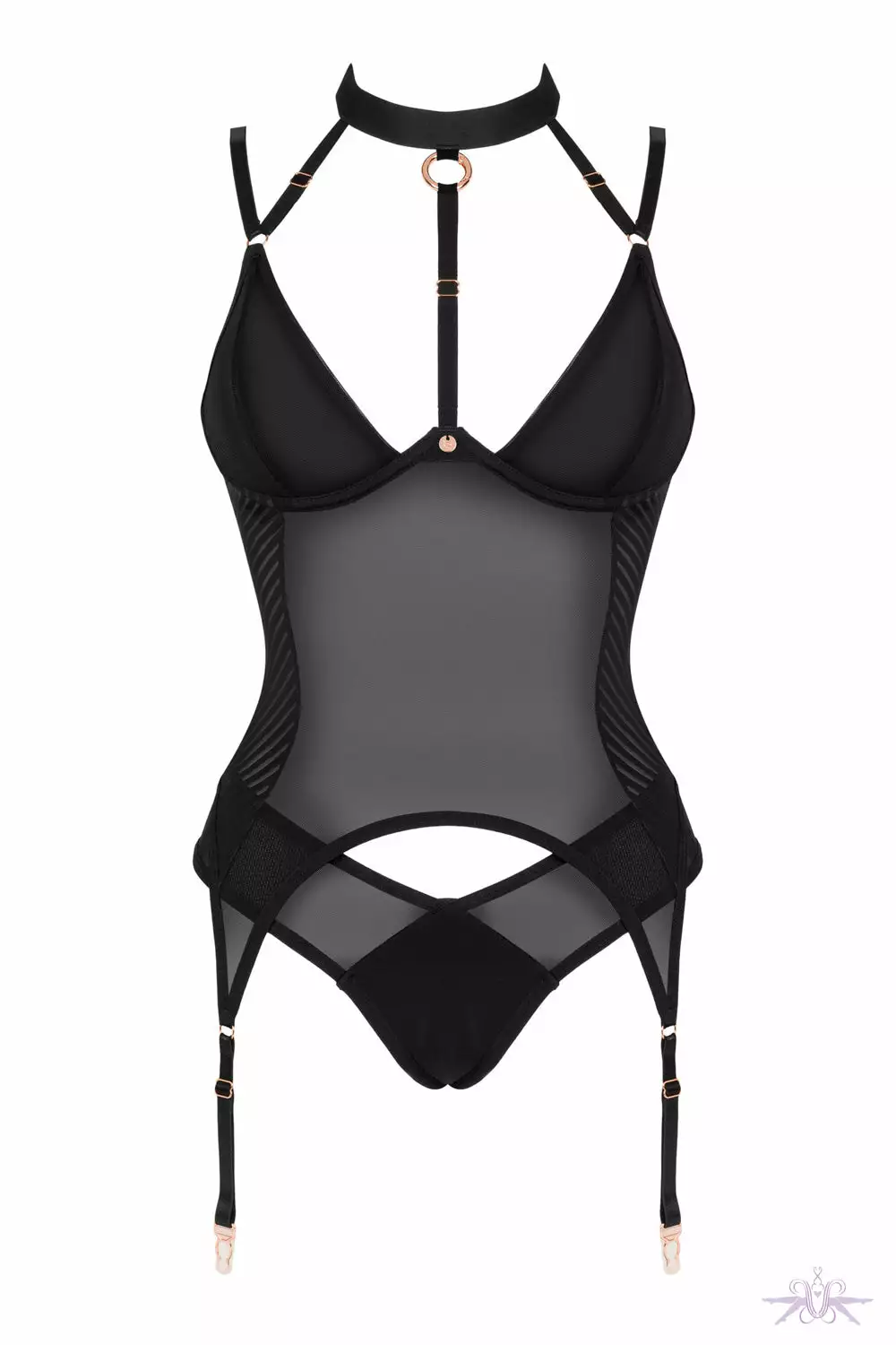 The black Brasica corset is a minimalist cut combined with beautiful details in a shade of rose gold. This is an exceptionally elegant design, made of delicate mesh. The sides of the corset decorated with stripes will beautifully accentuate your waist. Hook-and-eye fasteners, matching panties and a jewellery ring on the neck.