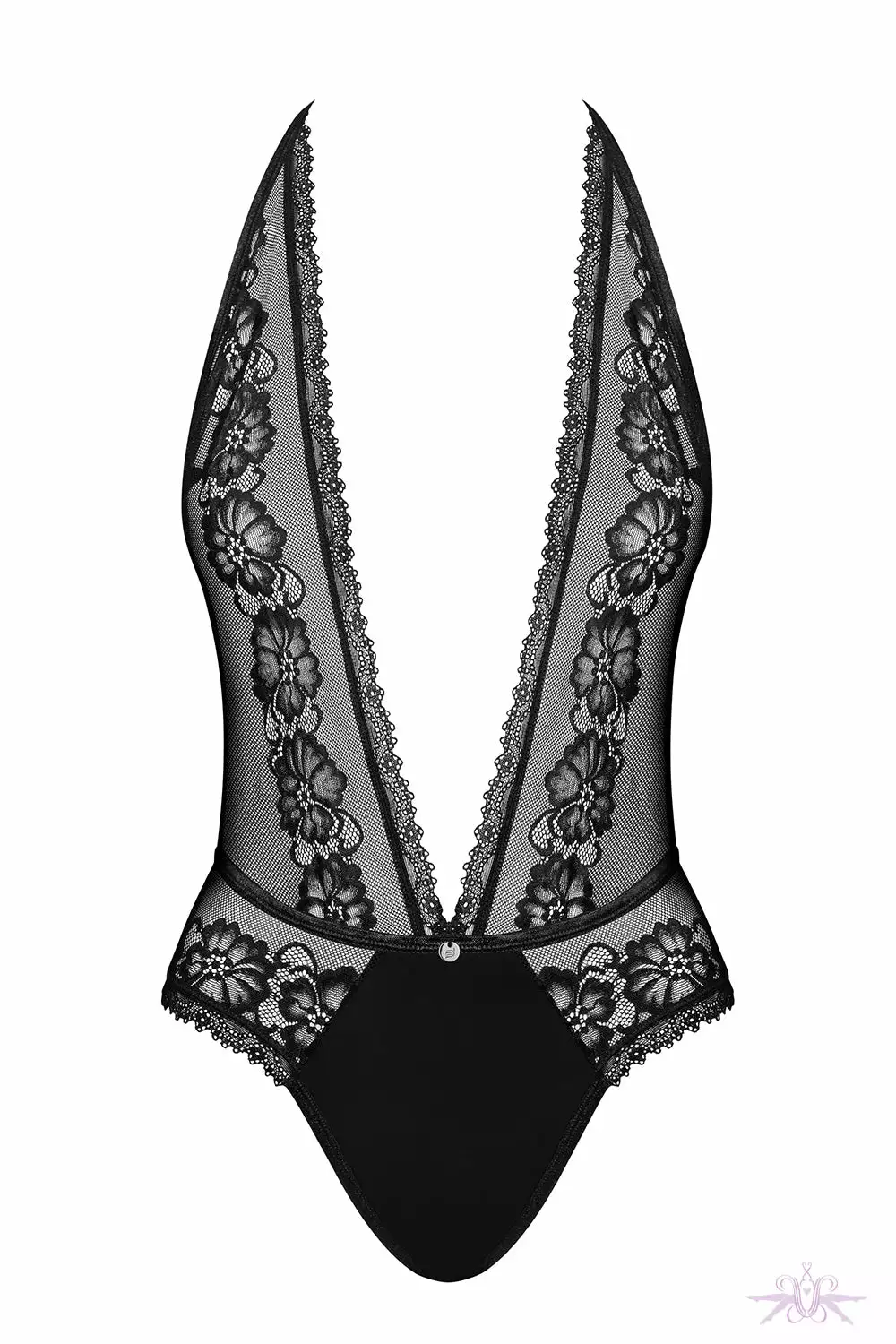 A sheer floral halterneck body with an open back for a seductive and feminine look. The deep plunging neckline has vertical lace adornments that lead to a panelled pantie effect, perfectly finished at the front with a silver logo motif for a luxurious feel. The sensuous open back with cross-over adjustable straps complete the look of this truly gorgeous lace bodysuit.