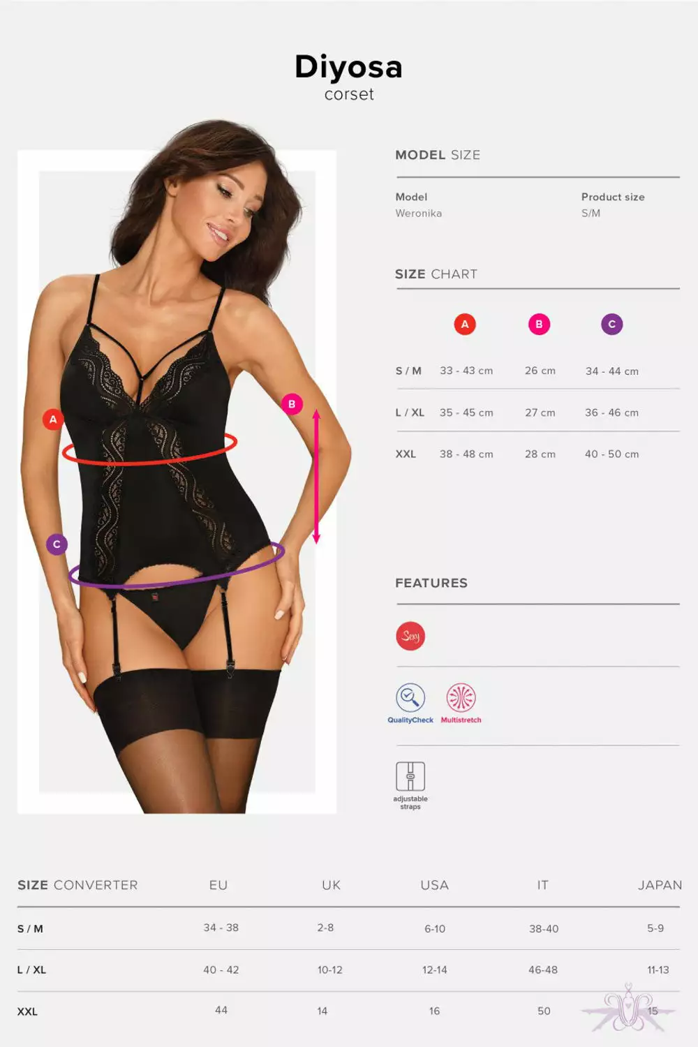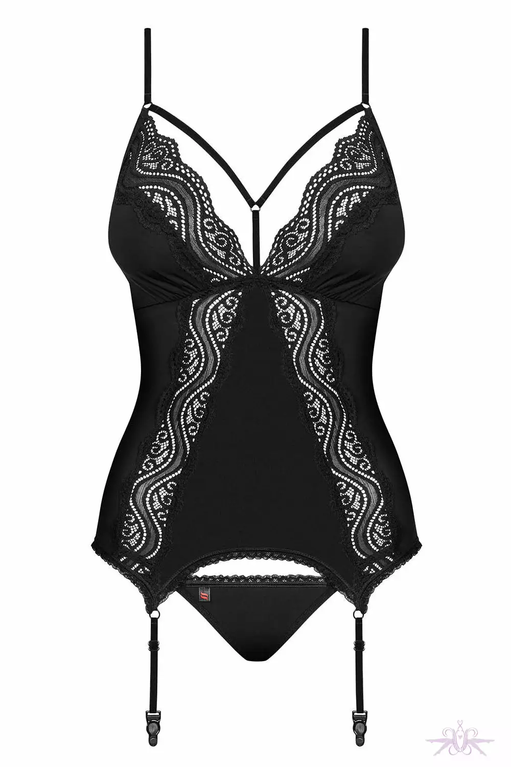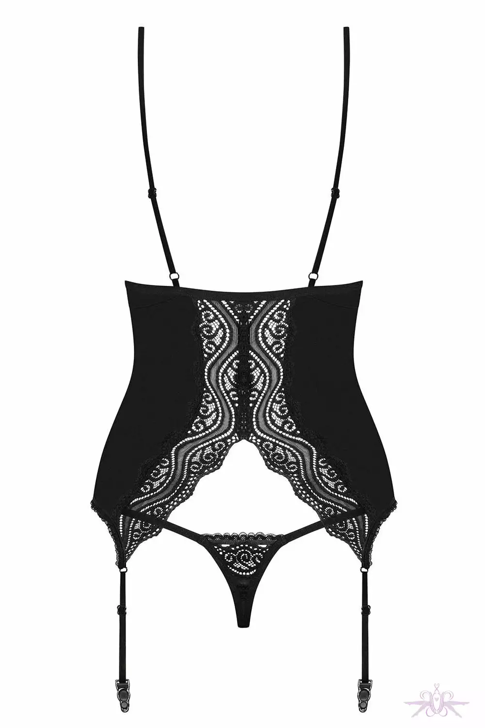 Sensual lace panelled corset from Obsessive. This soft and feminine corset consists of stretch microfibre and lace to skim your curves beautifully. The open back design has lace edging and really enhances the femininity of this corset. The delicate suspender straps have the sumptuous look with a velvet touch, this detail is echoed in the straps above the bust and shoulders.