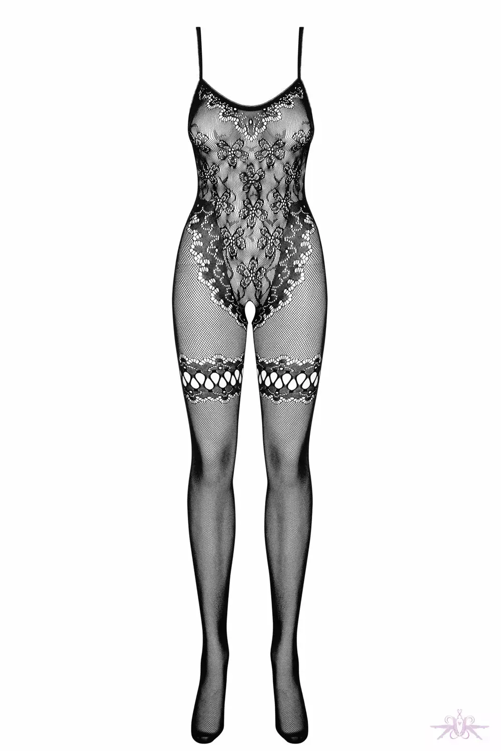 A lovely feminine floral bodystocking from Obsessive. This bodystocking has string shoulder straps and faux stocking detail. The floral detail adorns the body creating a bodysuit effect and this is continued at the thigh.