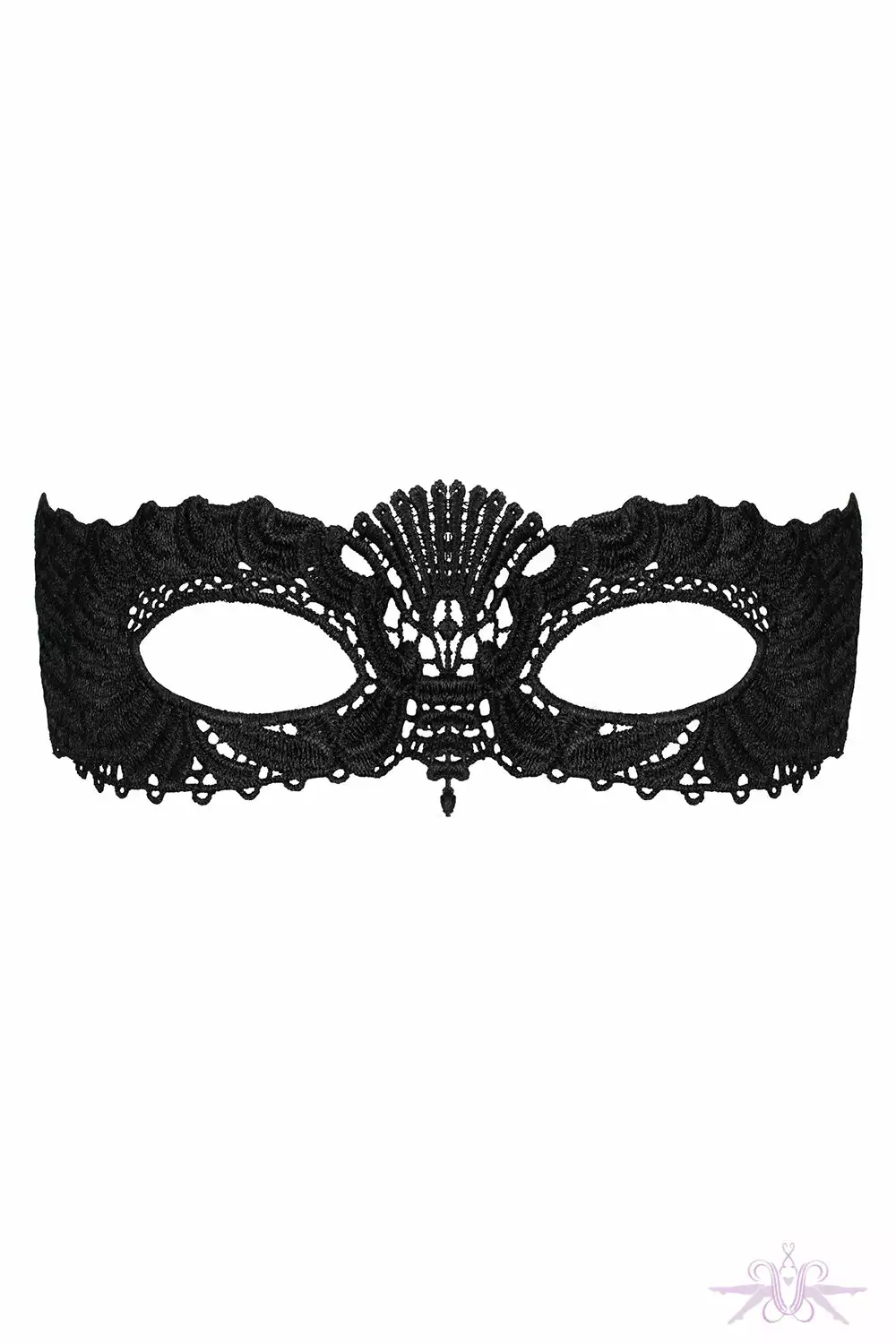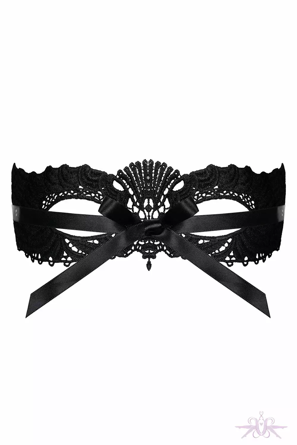 A tantalising lace mask from obsessive. Comprising of reinforced Guipure lace with satin ribbon ties. This coquettish item is sure to tempt.