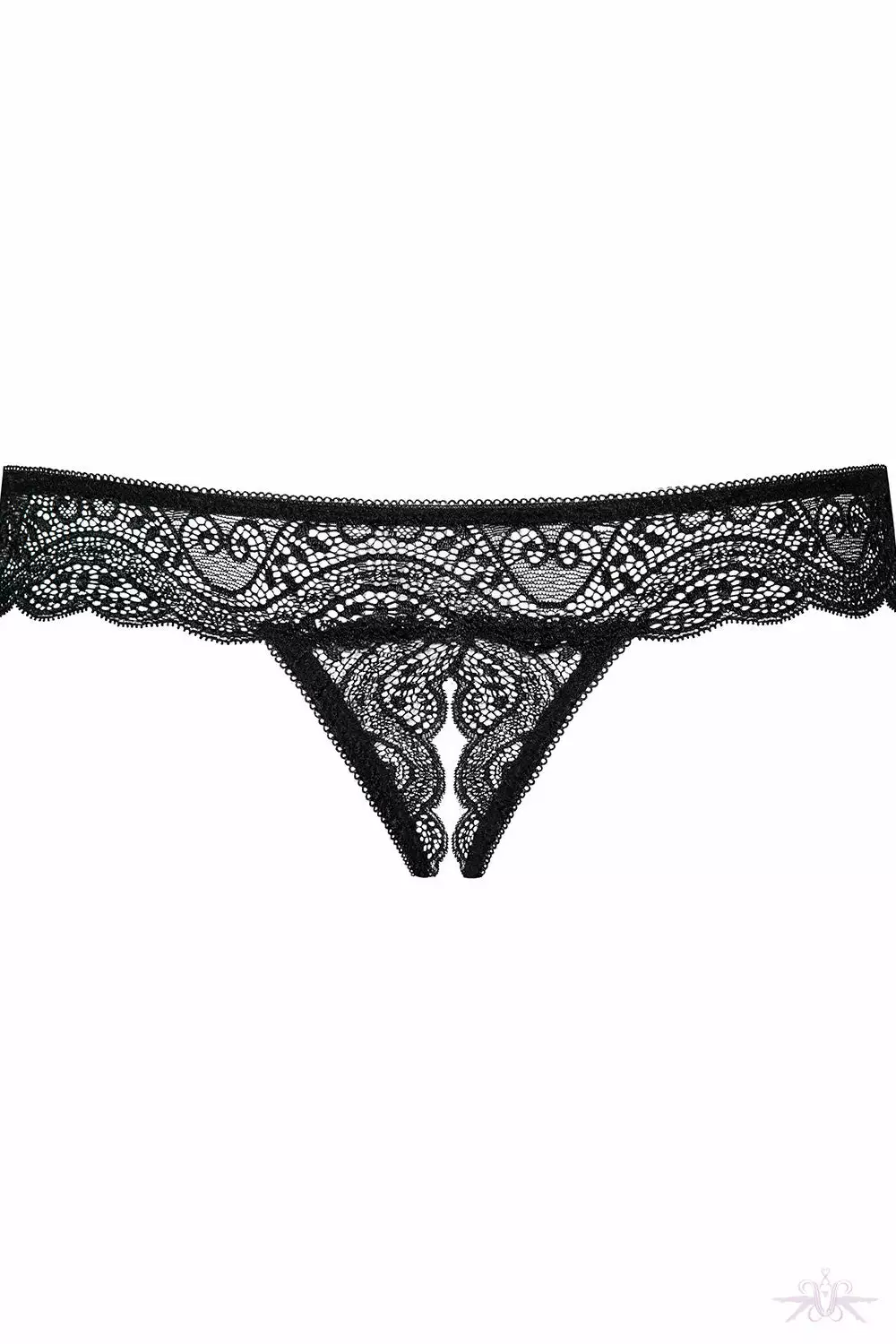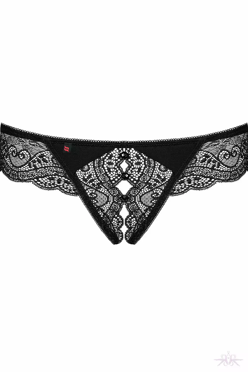 This stunning crotchless thong from Obsessive is delicately adorned with lace panelling. Beautiful floral lace and decorative set buttons to the front add an elegant effect. A perfect lingerie addition for the boudoir or everyday.