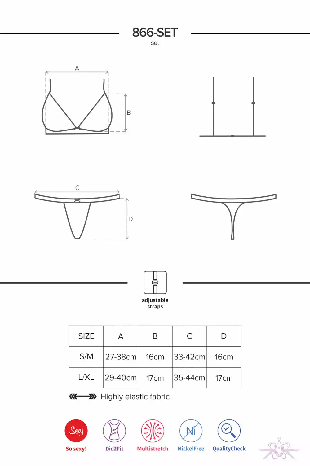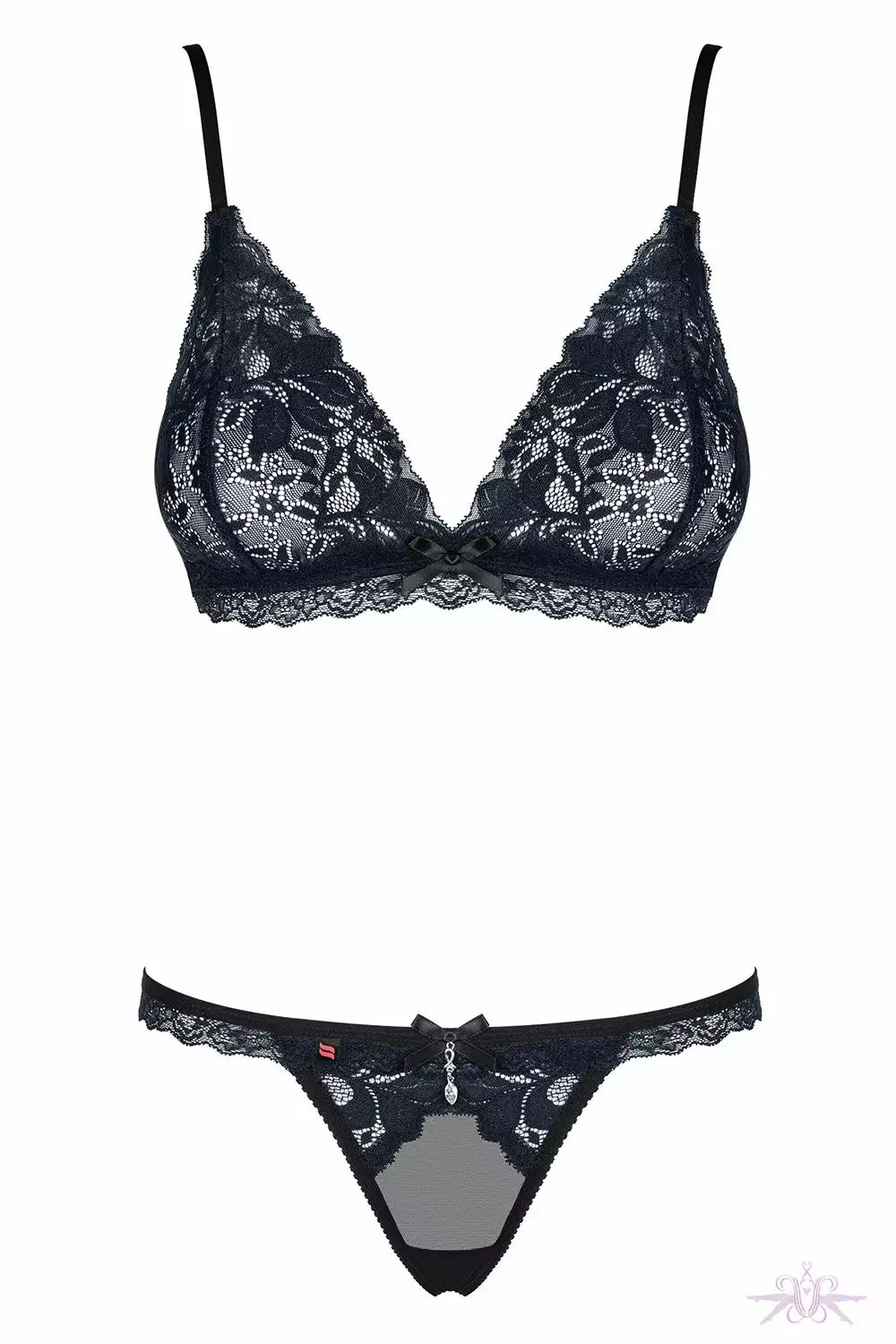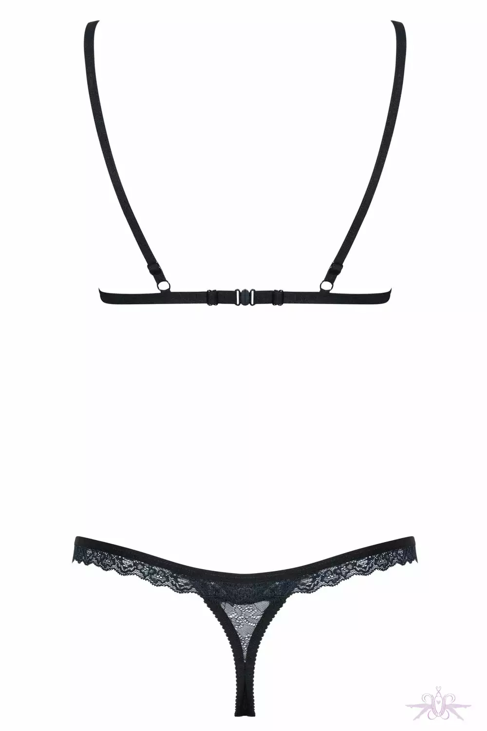 A gorgeous navy blue bra and thong set from Obsessive. This seductive two piece is made of navy and black lace, with delicate blue ribbon trim to the bra and thong. The bra has adjustable straps.