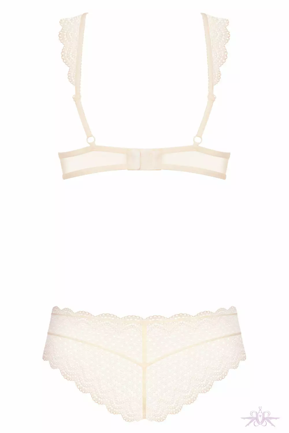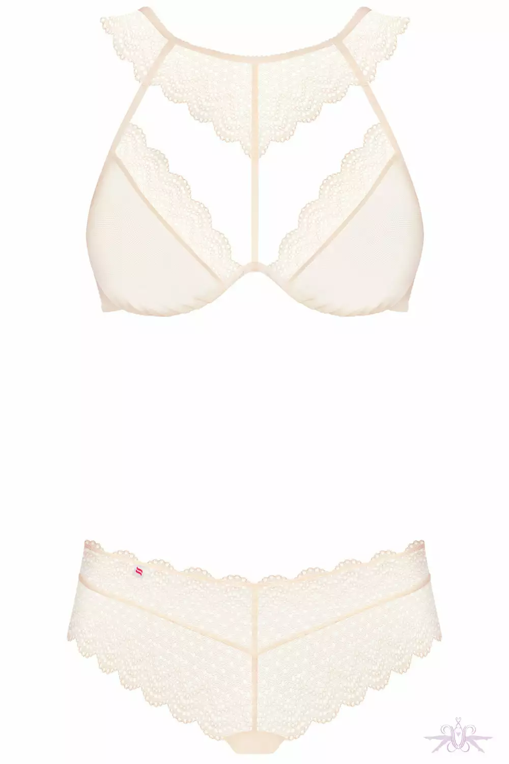 A charming lingerie set in pearl lace. This appealing two piece is made of smooth fabric and scalloped lace creating an elegant halter neck combination. The bra enhances the bust with its underwire, whilst the brief is alluring with its lace frill edging.