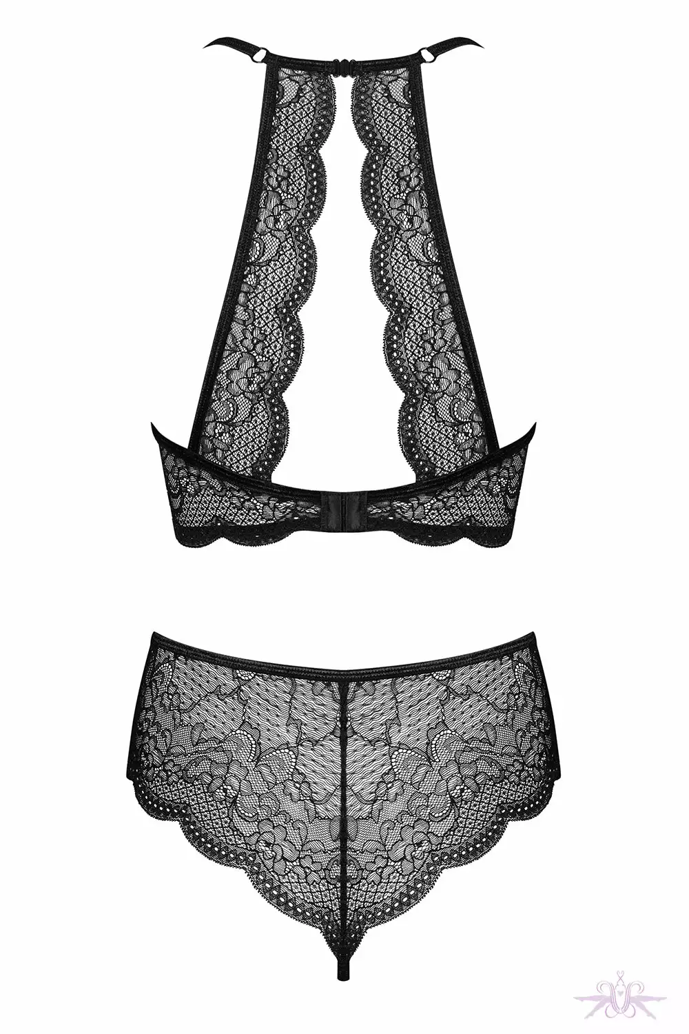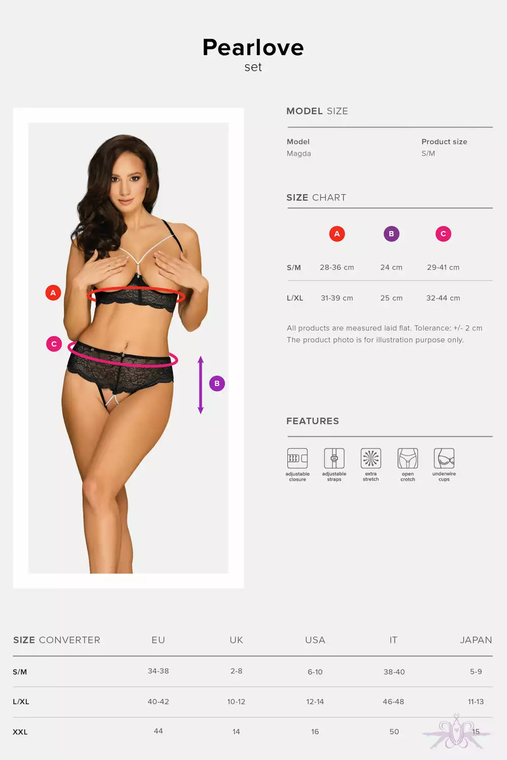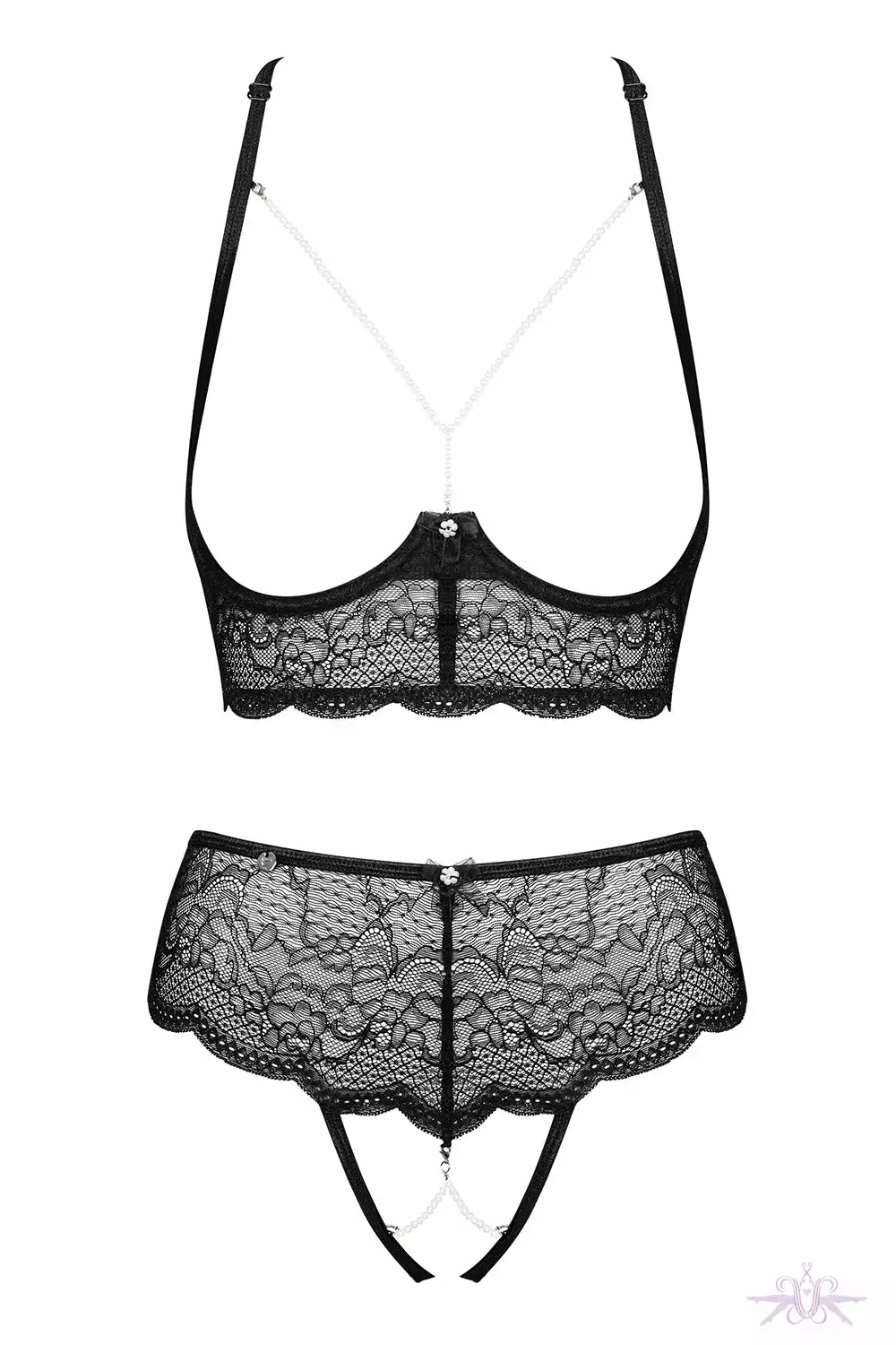 Divine lace cupless set with gorgeous pearl adornments and a feature scalloped lace design to the rear. The delicate straps are adjustable and the open pearl cups on the underwired bra make this a desirable piece. The deep lace band on the thong flatters the body with pearl accents that complete this set beautifully. Matching items available.