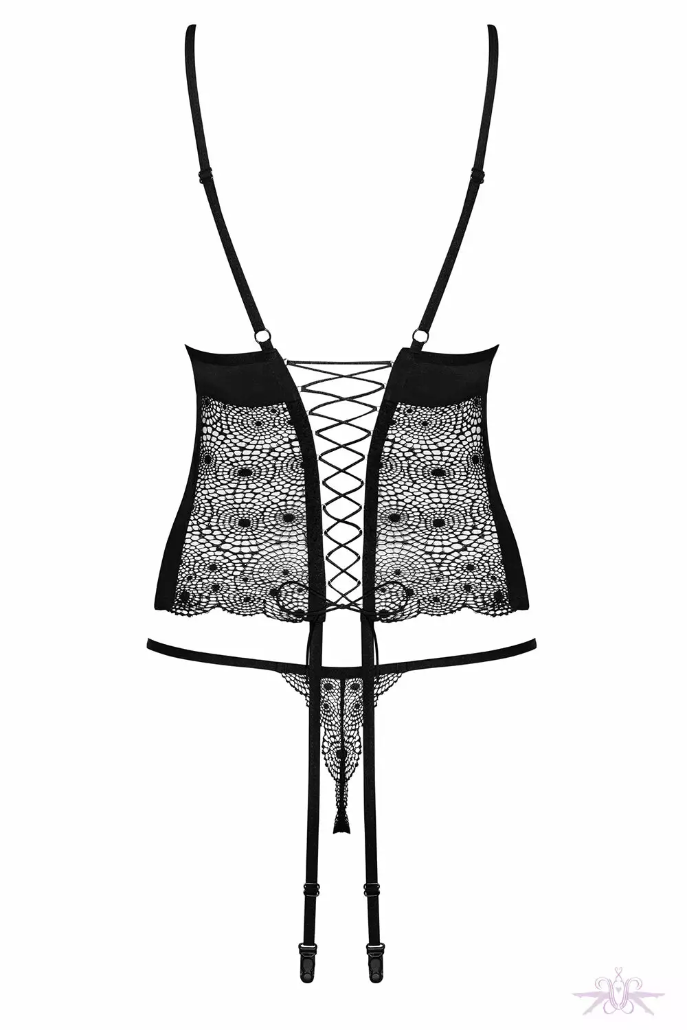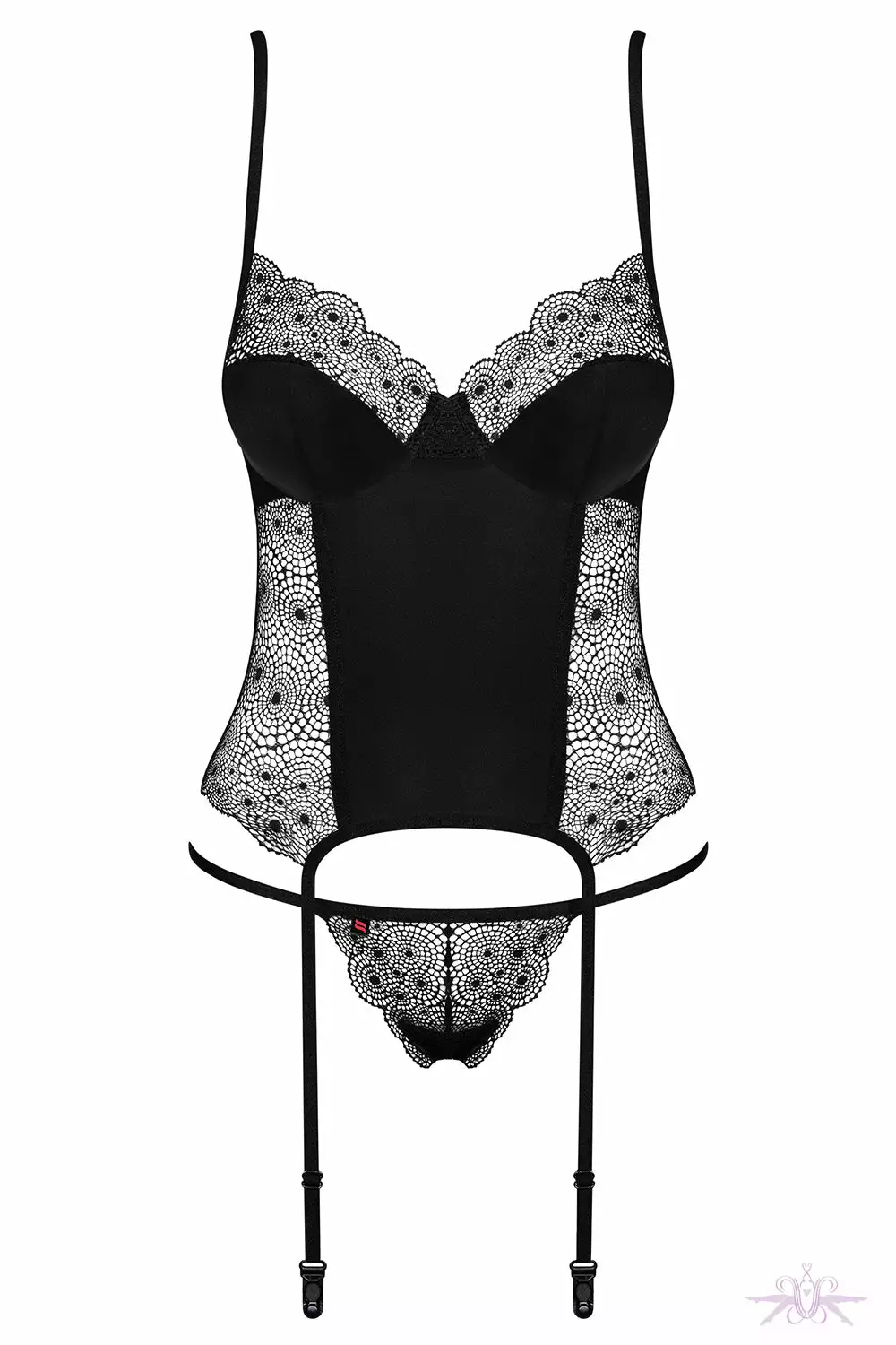 An extremely feminine and eye-catching corset to make you feel special. The black lace detail is sumptuous and feels divine. The non padded cups are underwired and enhance the bust. The panelling at the front elongates the body whilst the lacing on the back of the corset helps to create the perfect shape. There are four adjustable suspender straps to hold your stockings securely in place. Matching thong is also included.
