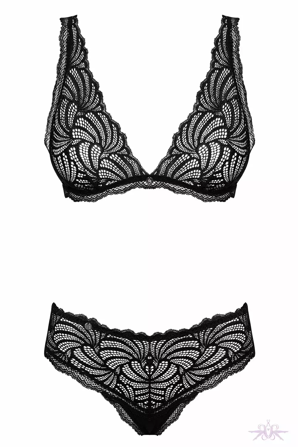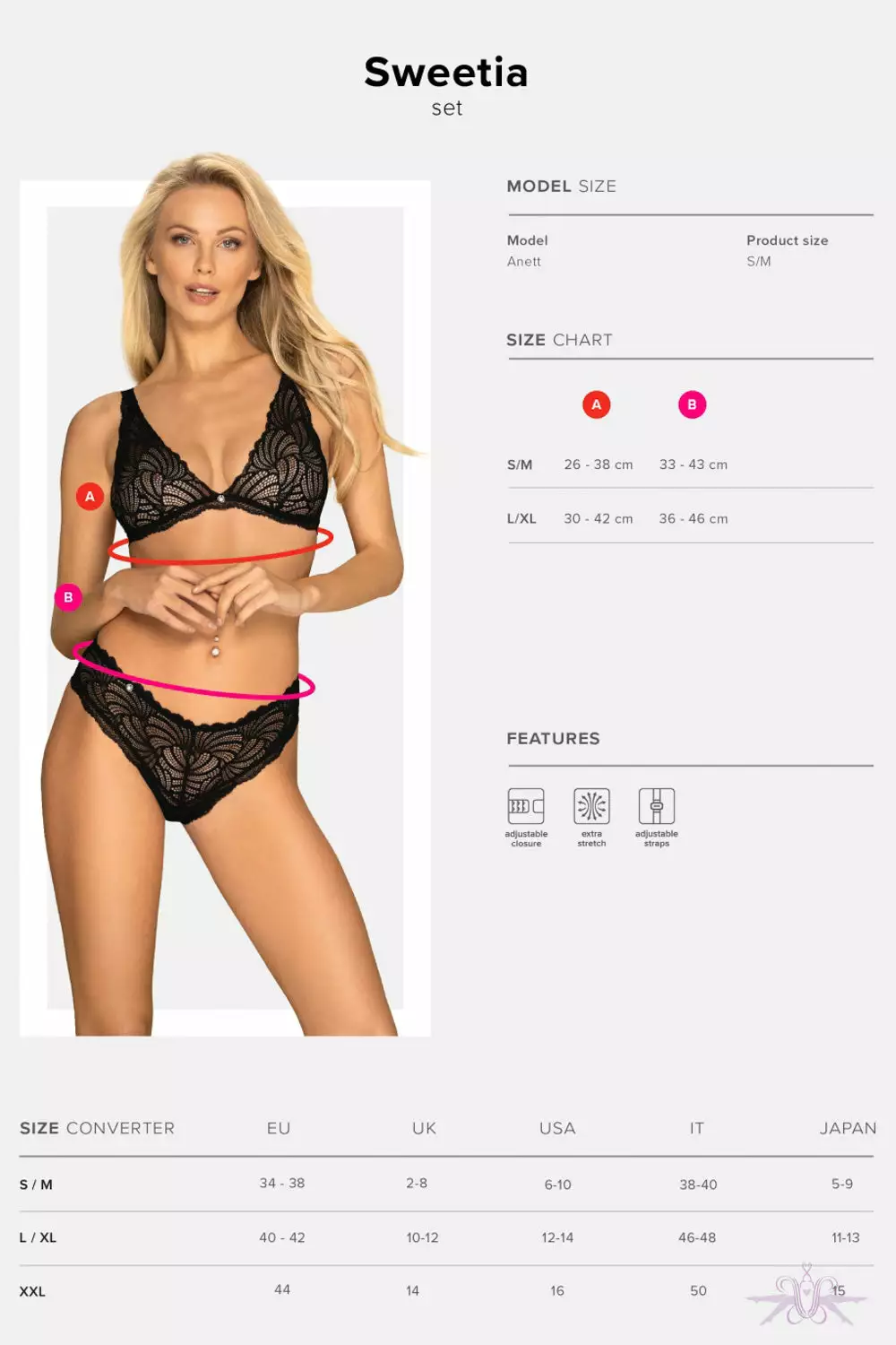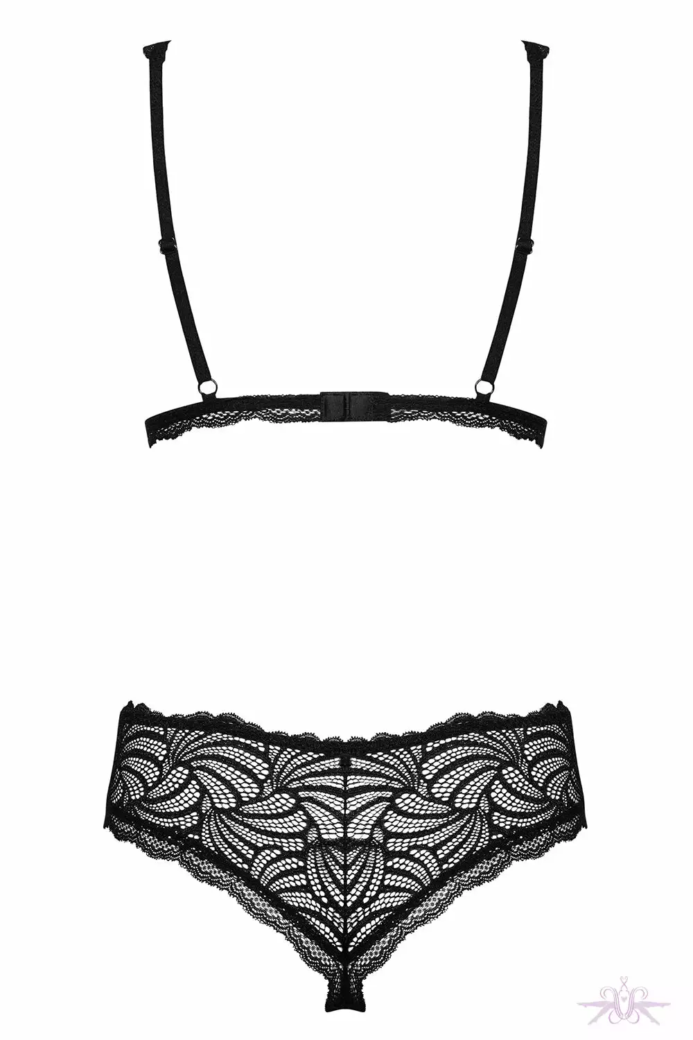 A bra and thong set to feel amazing in as the lace bra will gently reveal what needs to be and the thong will expose the alluring derriere. The bra is a beautiful see through lace design with adjustable straps perfect for the slightly smaller bust. The thong has a triangular cut to the hips with a lovely lace wavy finish that completes the set so well.