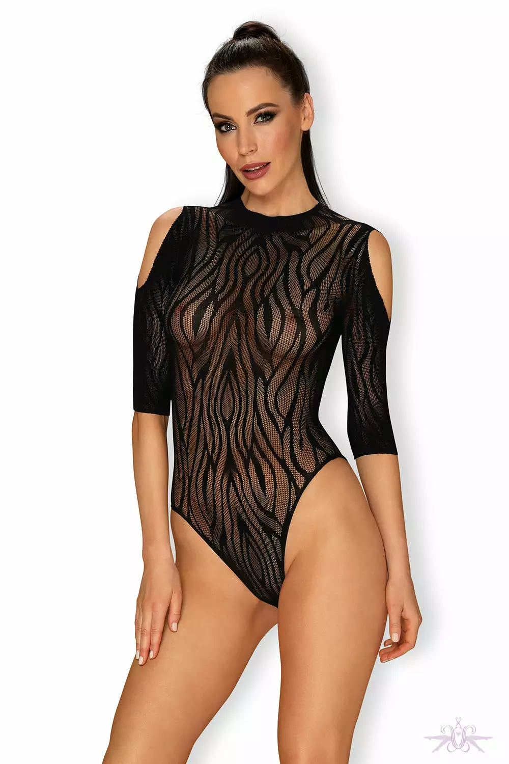 A gorgeous zebra fishnet bodysuit from Obsessive. Featuring cold shoulder details and three quarter sleeves with a large keyhole back for an alluring effect.