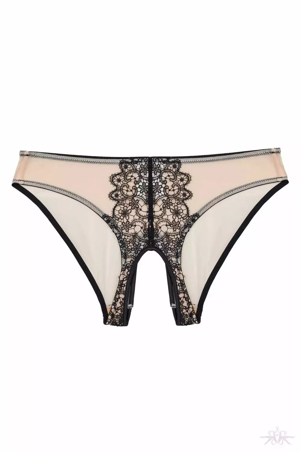 A provocative sheer open brief from Playful Promises. Sheer nude mesh with delicate black lace accents make this stunning sheer open brief with a playful feel. Edged in luxurious satin these briefs can be styled with matching items from the Anaise collection.
