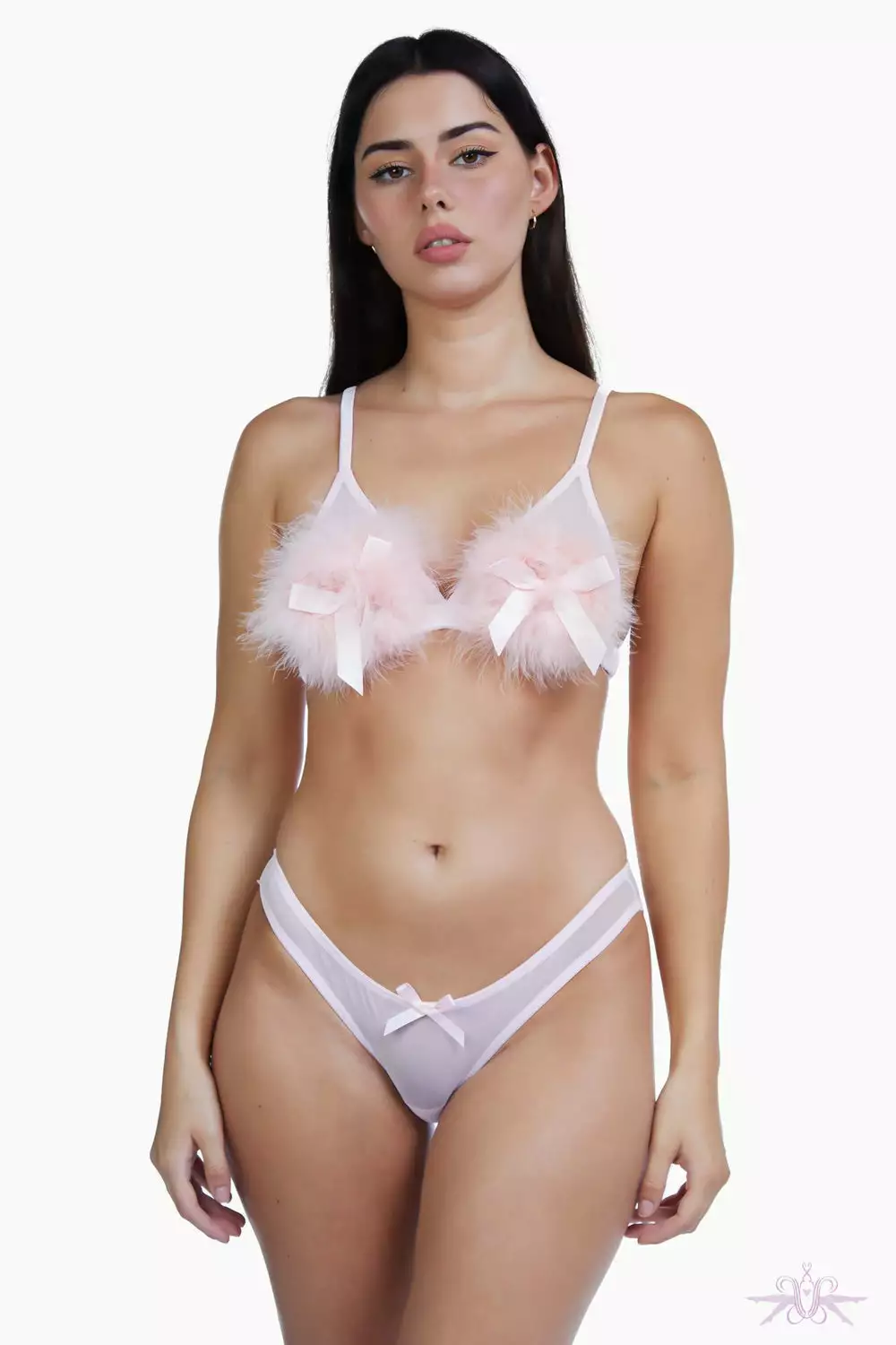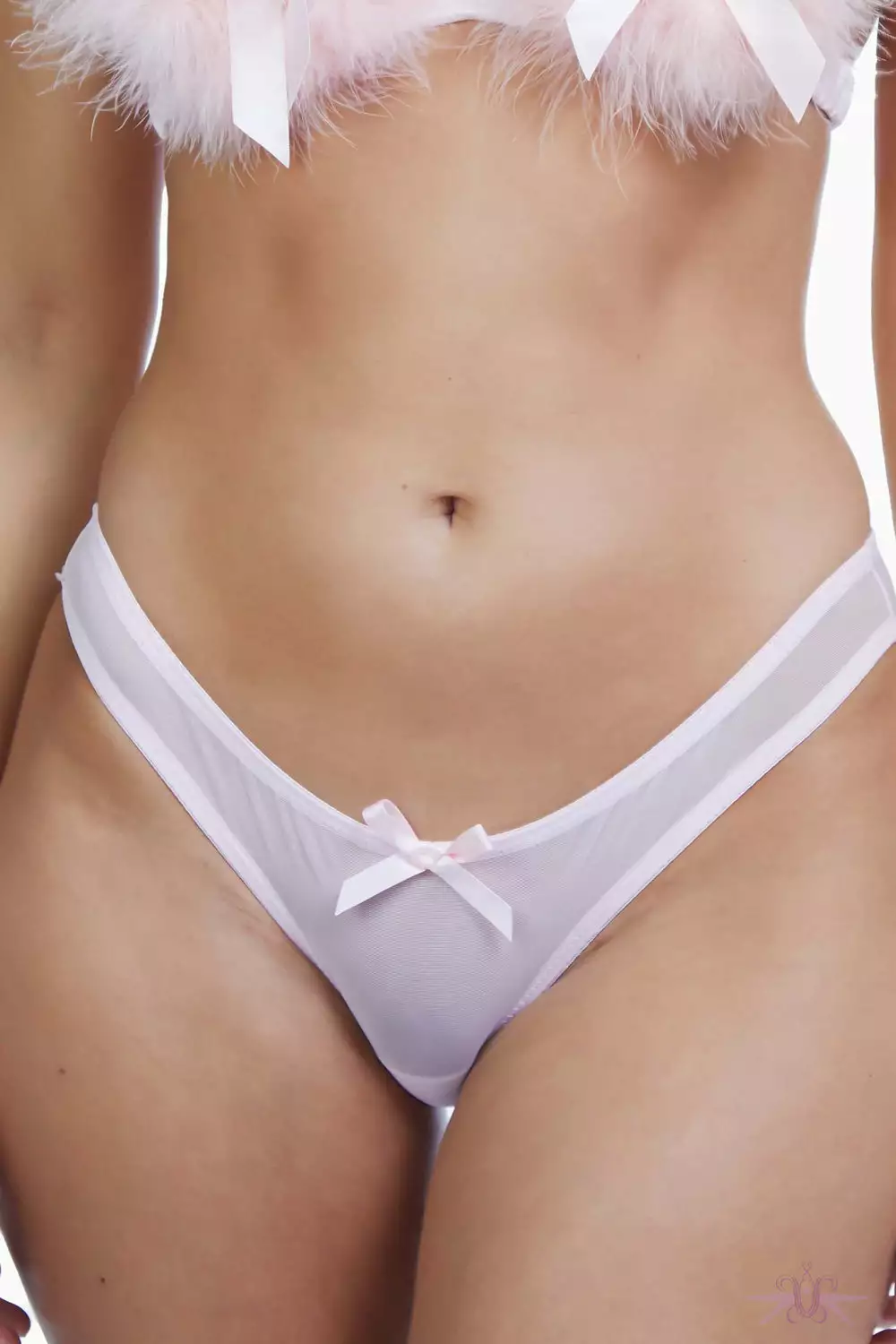 A tantalising sheer brief to tickle your fancies. Bring out your fun frivolous side with this gorgeous little sheer brief with feather a powder puff to the front and a satin bow adorning the back. Add some Ooh La La to your lingerie collection. Matching bra is available.
