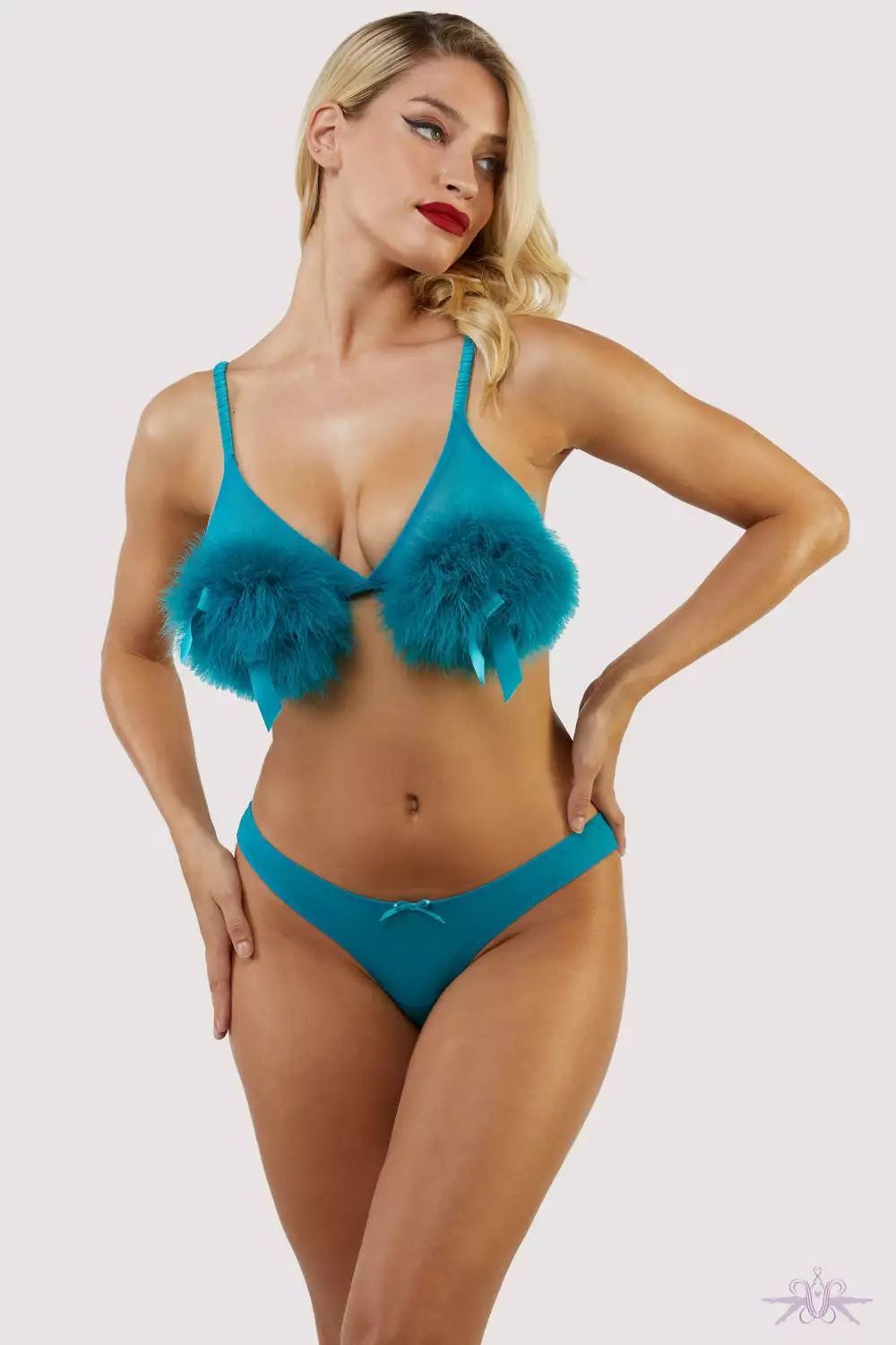 A tantalising triangle bra to tickle your fancies. Bring out your fun frivolous side with this gorgeous little sheer bra with feather powder puffs and satin bows. A triangular cut non-wired bra with an elasticated satin band. Add some Ooh La La to your lingerie collection.