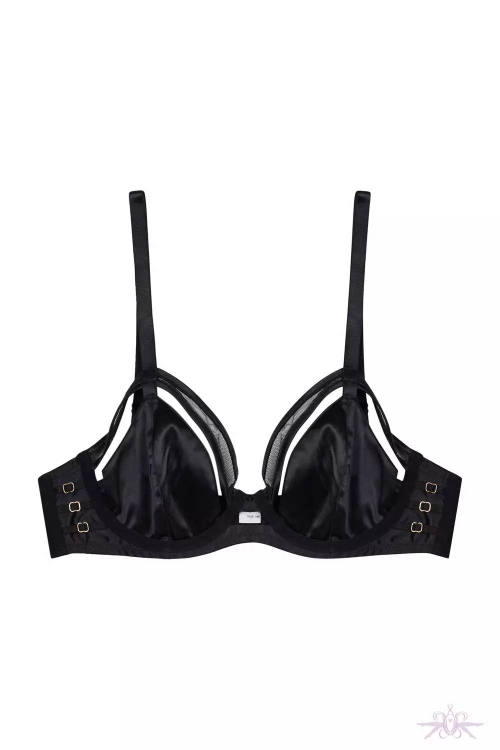 A seductive and sophisticated plunge bra from the Charlie collection at Playful Promises. This bra is in a gorgeous sleek black satin featuring a strong plunge with cut out detailing around the cup. Matching suspender belt, thong and brief are also available.