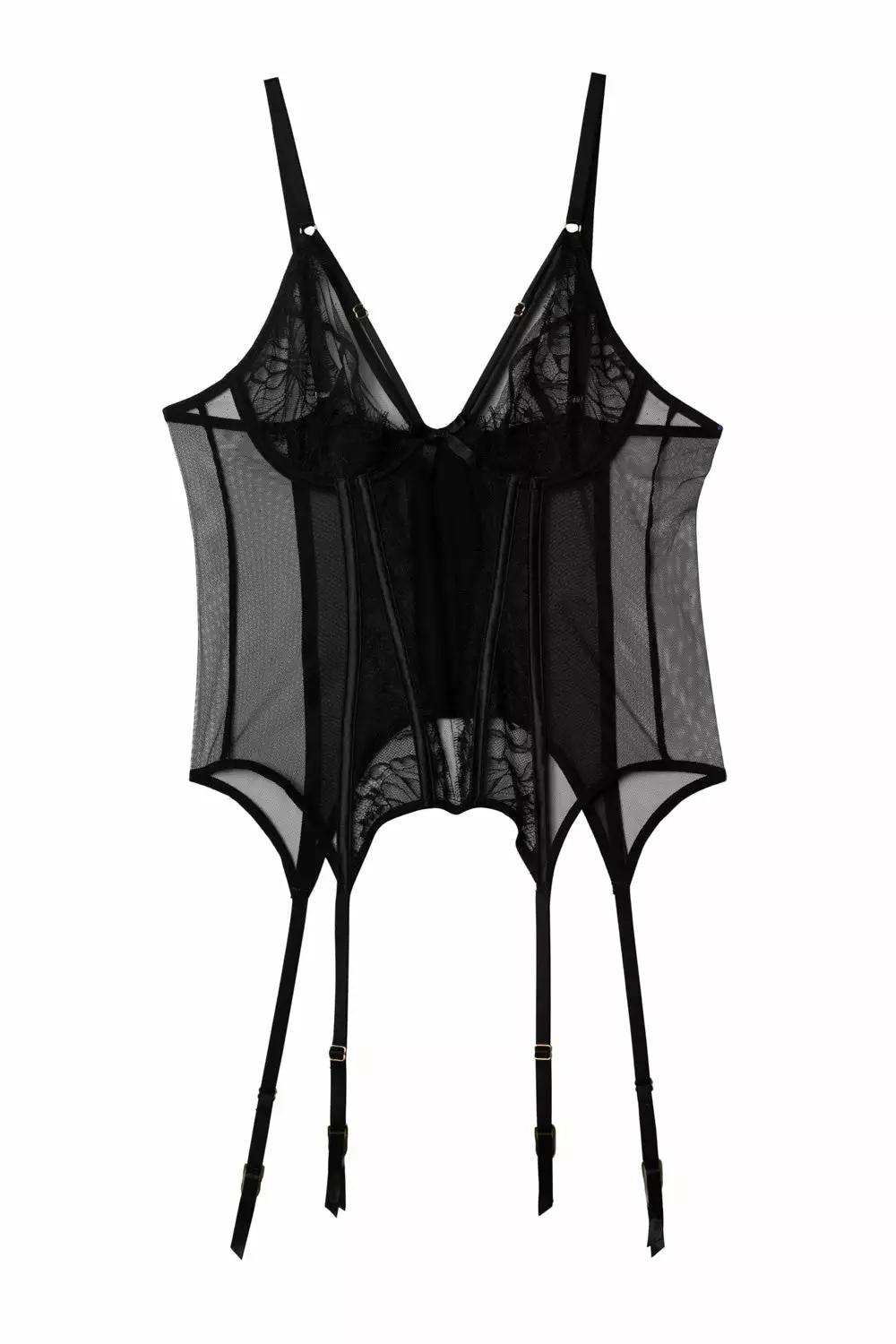 A glamorous black basque from Playful Promises. This basque is beautiful with sheer black mesh cups to reveal the bust and lace accents. It has hook and eye fastening to the rear and adjustable shoulder straps. The matching choice of brief or thong is also available.
