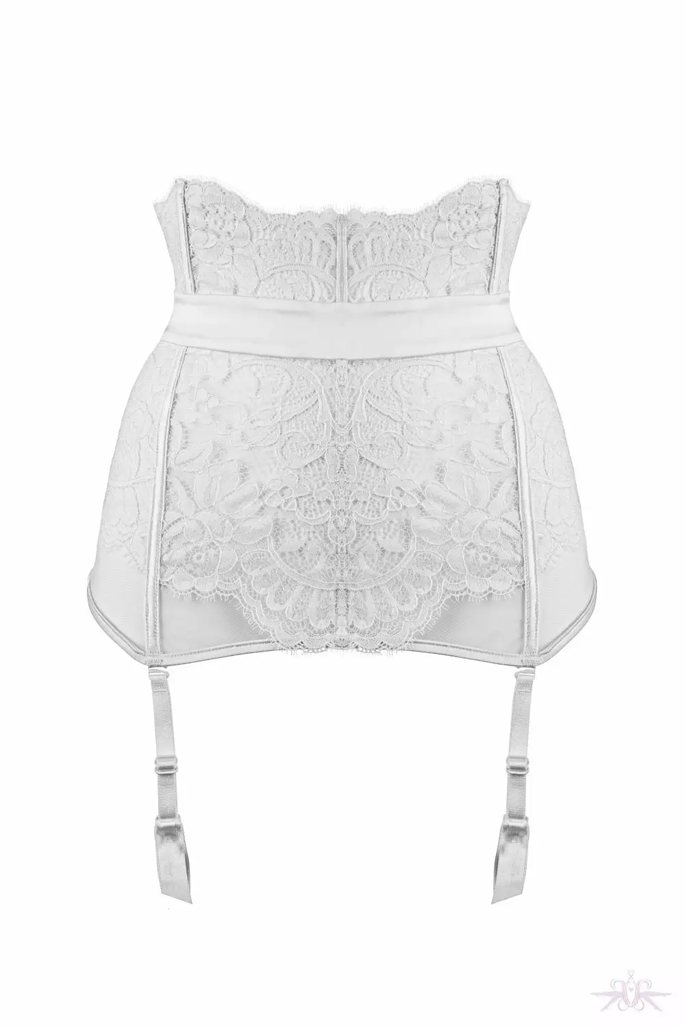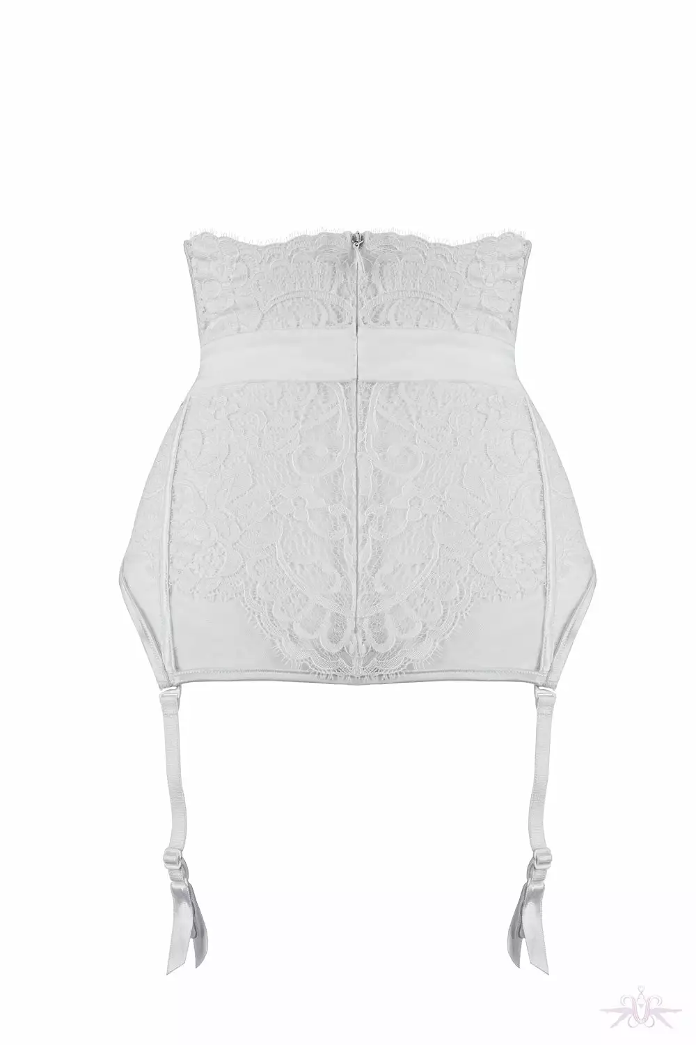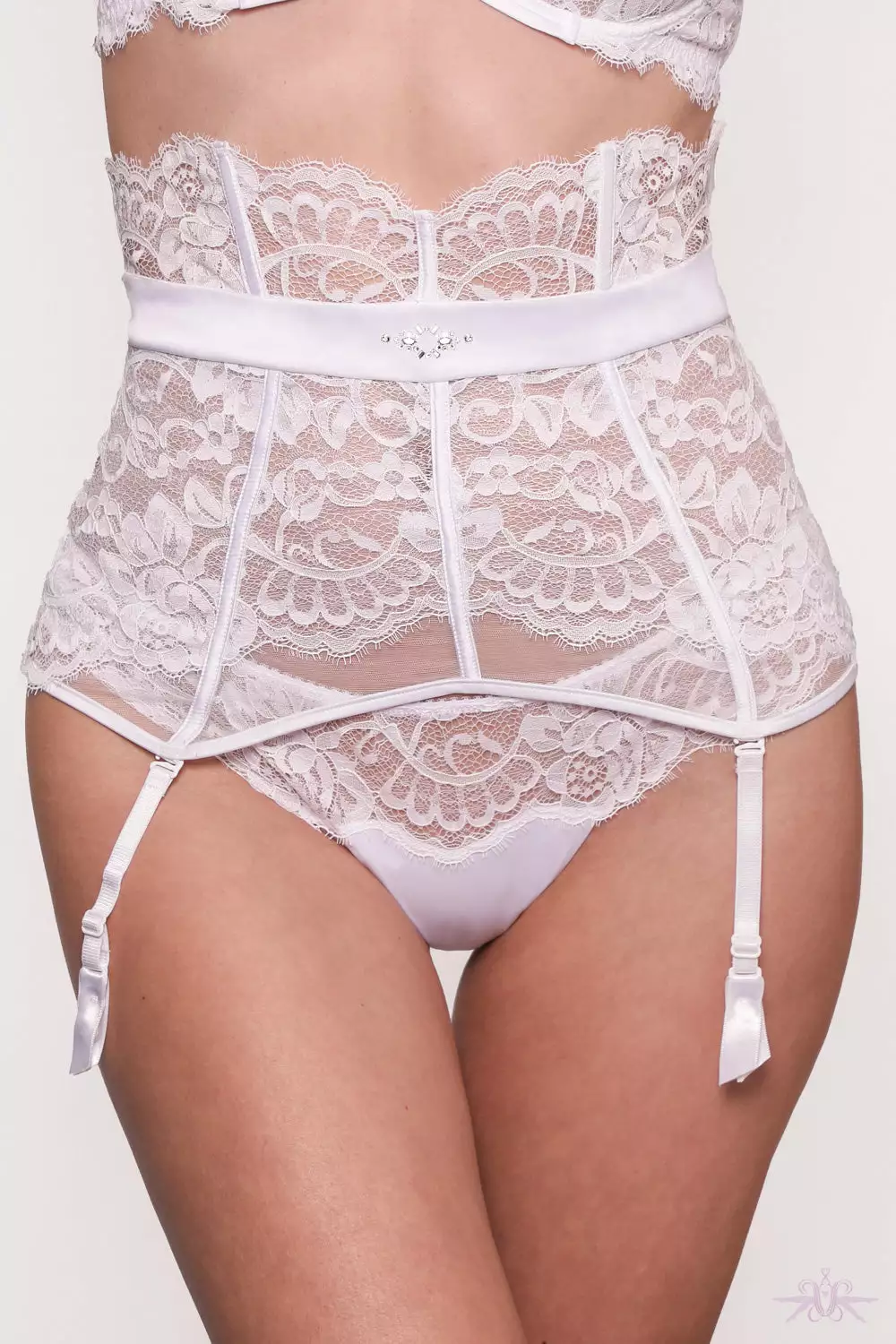 A luxurious suspender belt from Prelude Milano. This white belt in satin and lace is so beautiful and sits so elegantly on the waist. Swarovski crystals adorn the front and the soft boning adds structure to the piece. Four adjustable suspender straps help hold your favourite stockings in place.