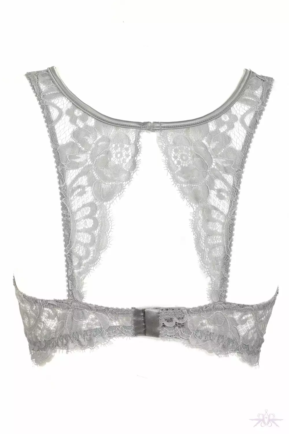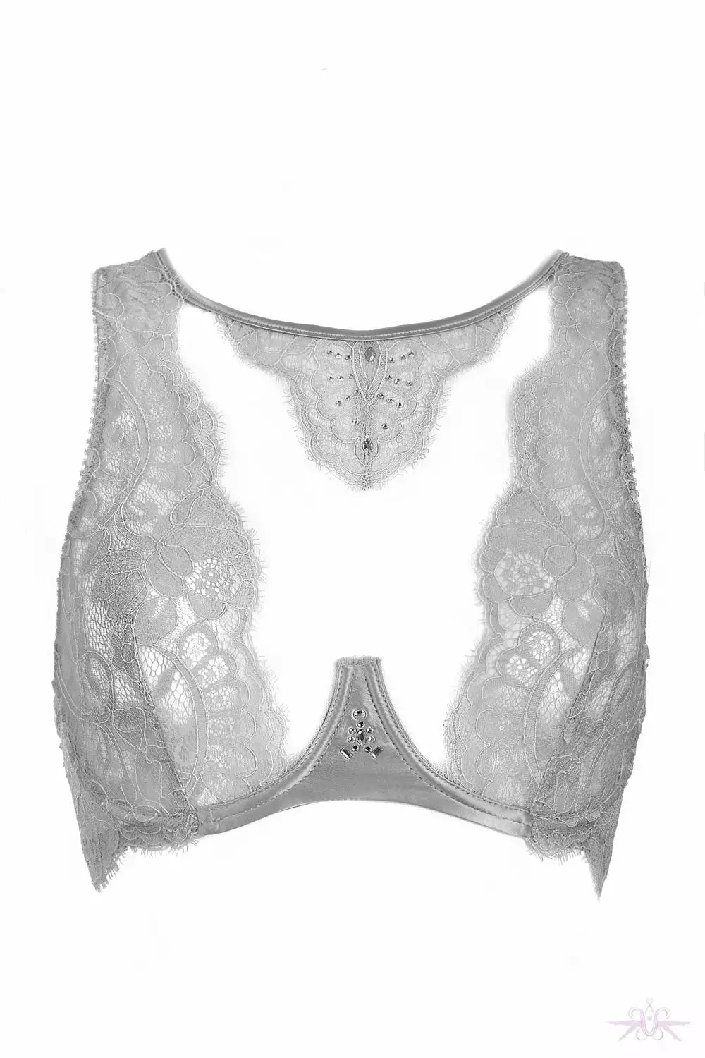An alluring bra in lace and tulle from the Marlene collection at Prelude Milano. This satin edge underwired bra is truly stunning with the sheer section covering yet enhancing the bust. The triangular section of lace that surrounds the breasts adds a gorgeous feminine accent and the silver Swarovski crystals in the centre add sparkle. The back of the bra has two vertical lace straps which are connected at the top. The bra is fastened by way of a hook and eye.