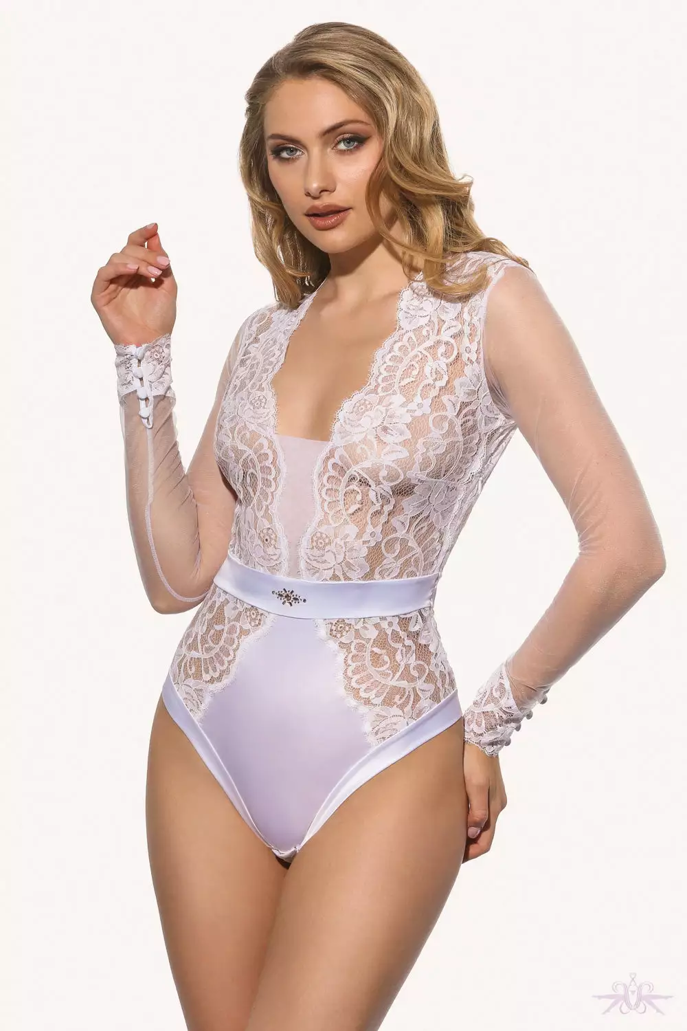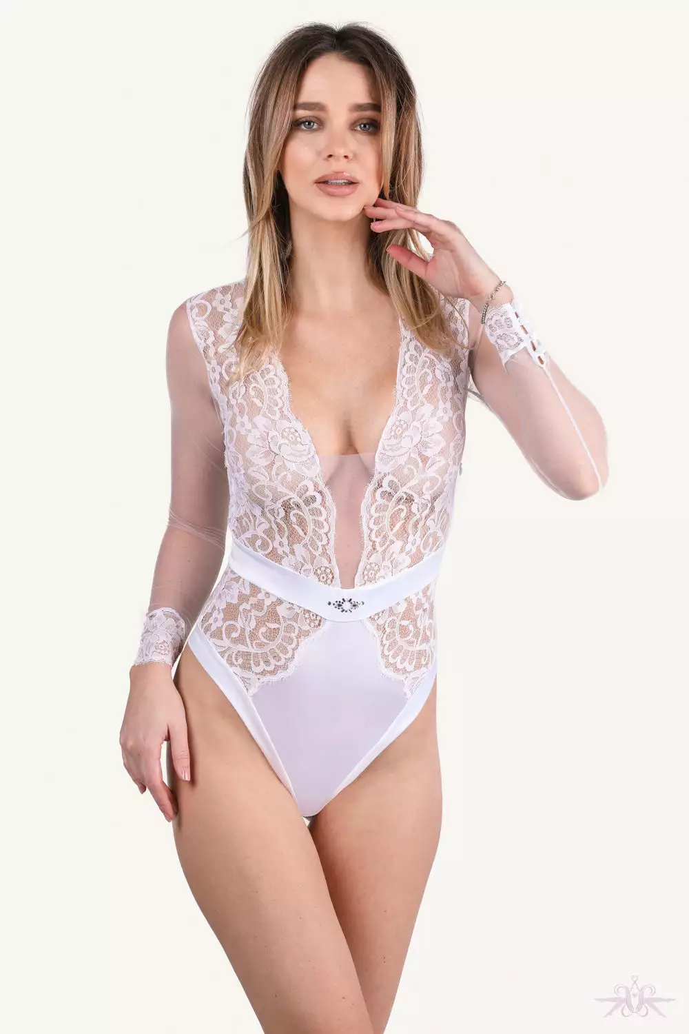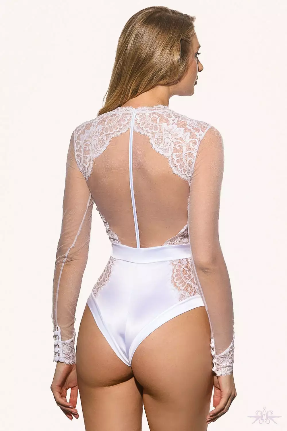 This luxurious white bodysuit from Prelude Milano is stunning with its satin and lace details. The bodysuit has decadent sheer long sleeves with a lace cuff and satin buttons and the lace panels to the front and rear are so glamorous and make this piece of lingerie really stand out. One of the highlights is the high neckline at the back with a sheer panel closed with a zip. The second are the Swarovski crystals on the satin waistband at the front which add glamour and decadence. A bodysuit which can be worn as a stand alone piece under a jacket or as lingerie.