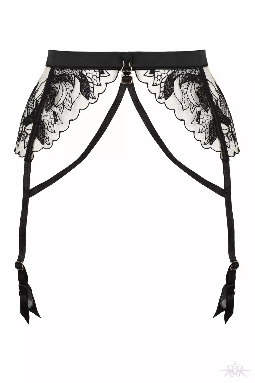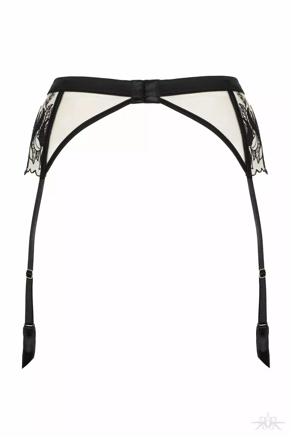 A gorgeous suspender belt from the Prelude collection at Jolidon. Translucent mesh with delicate scalloped edging sit beautifully on the body and the skin coloured mesh is adorned with black floral lace. The satin waist band is slightly elasticated with a little black button to the front where the signature suspender clip detail sits. Adjustable four strap belt with hook and eye fastening to the rear. Matching items are also available.