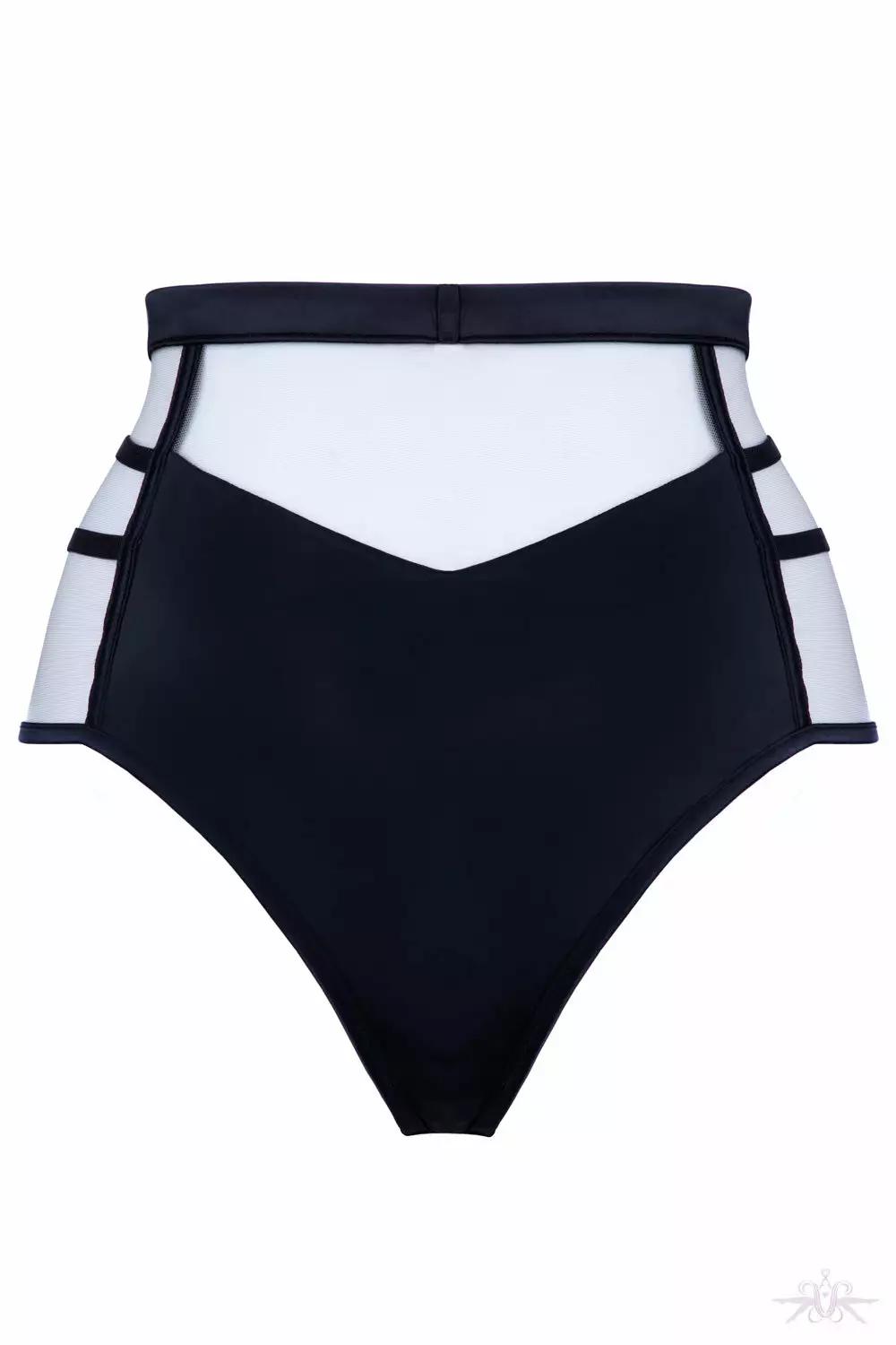 A luxurious high waist Brazilian knicker from Prelude Milano. Sumptuous satin, lace and tulle are combined to create a gorgeous garment that looks amazing. The detail is so refined with nude tulle panelling to the front adorned with black floral lace and four elastic side straps that fasten with suspender clips. The back has a v-shaped black satin design and this satin is continued on the waistband and gusset. Matching items are also available.
