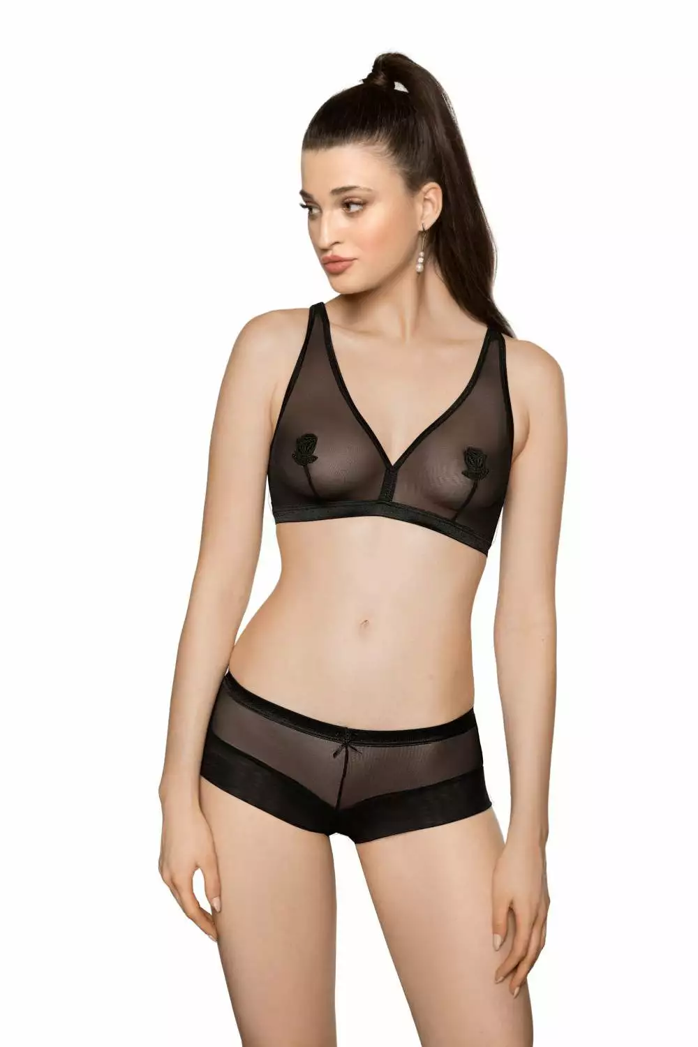An alluring black brief made from gorgeous soft fabric. The front is sheer tulle and the back has amazing floral open applique detailing and the cut of the brief sits seductively on the bum. Matching triangle bra and thong are also available.